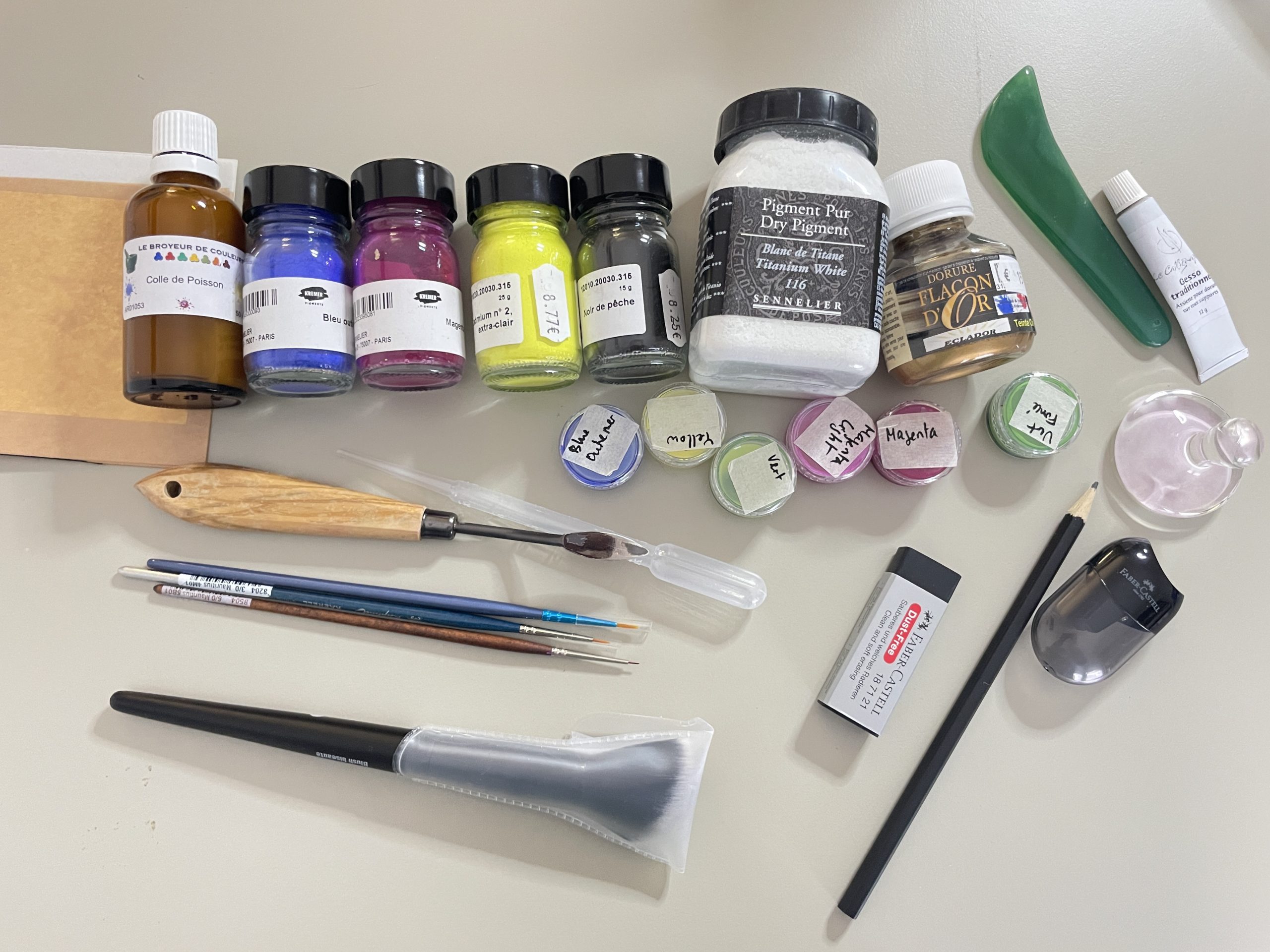 Suite à mon stage d’enluminure, j’ai acheté différents outils pour la fabriquer à domicile. Voici ce que j’ai acheté :